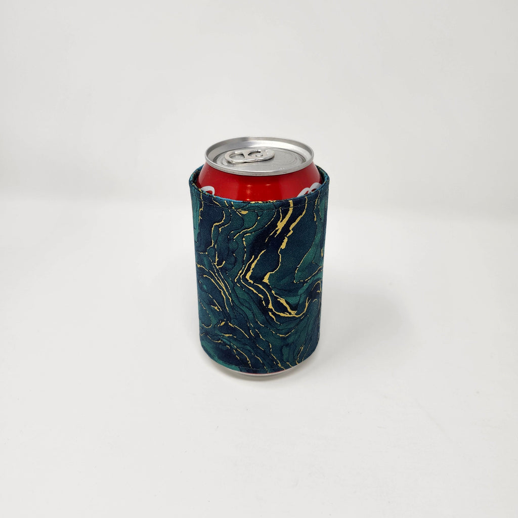 The drink cozy has two different prints and is designed so that it can be used with either of the two prints facing outwards making it fully reversible.